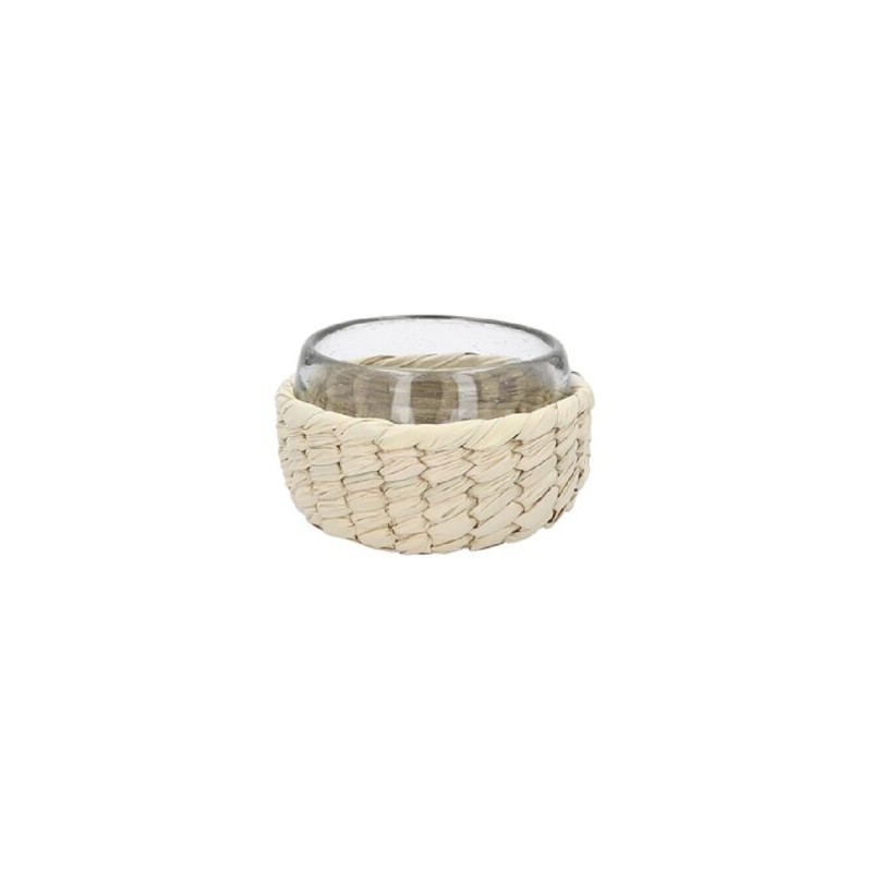 Vaso mezcalero hecho a mano a partir de vidrio soplado reciclado con funda de palma. Qué mejor que disfrutar de un mezcal que en un vaso que refleje las mismas cualidades artesanales de nuestras bebidas. Usa nuestros bowls para servirlo con unas rodajas de naranja y sal de gusano.